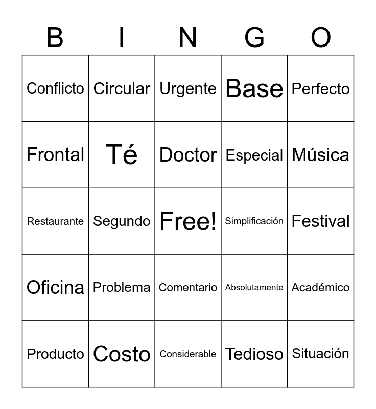 This bingo card has a free space and 188 words: Global, Acción, Adaptación, Admiración, Aplicación, Asociación, Aspiración, Celebración, Civilización, Clasificación, Colaboración, Ficción, Formación, Nación, Simplificación, Aniversario, Comentario, Contrario, Diario, Glosario, Primario, Salario, Secretario, Vocabulario, Académico, Artístico, Auténtico, Automático, Básico, Característico, Clásico, Dinámico, Doméstico, Electrónico, Fantásitco, Heroico, Irónico, Mágico, Romántico, Delicioso, Glorioso, Misterioso, Numeroso, Precioso, Religioso, Tedioso, Abstracto, Acto, Artefacto, Compacto, Conflicto, Contacto, Correcto, Exacto, Excepto, Insecto, Perfecto, Producto, Usar, Teléfono, Té, Terrible, Historia, Temperatura, Estado, Especial, Social, Situación, Servicio, Segundo, Repetir, Regular, Problema, Posible, Popular, Persona, Perfecto, Pasado, Perdón, O, Es, En, Opinión, Número, No, Necesario, Naturaleza, Música, Minuto, Menú, Restaurante, Lenguaje, Interesante, Favorito, Fantástico, Familia, Excelente, Dólar, Día, Costo, Café, Alérgico, Absolutamente, Accidente, Crimen, Doctor, Emergencia, Hospital, Médico, Medicina, Policía, Urgente, Universidad, Teatro, Tren, Estación, Parque, Oficina, Océano, Norte, Montaña, Mapa, Isla, Hotel, Explorar, Distancia, Carro, Banco, Aeropuerto, Actor, Admirable, Agenda, Altar, Animal, Area, Artificial, Auto, Base, Brutal, Cable, Canal, Cáncer, Canon, Capital, Carbón, Central, Cerebral, Chocolate, Circular, Civil, Club, Conclusión, Conductor, Considerable, Control, Criminal, Crisis, Cultural, Debate, Decisión, Diagonal, Dimensión, Director, Disco, División, Doctor, Drama, Editorial, Electoral, Elemental, Error, Experimental, Explosión, Extensión, Exterior, Factor, Familiar, Fatal, Federal, Festival, Final, Flexible, Formal, Fórmula, Frontal, Fundamental, Gas and General.