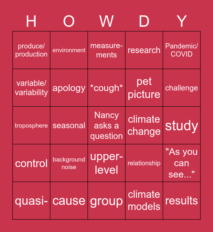 This bingo card has a free space and 38 words: Bad joke, "Please mute yourself", Thank you, apology, "As you can see...", background noise, *cough*, technical issues, Pandemic/ COVID, pet picture, seasonal, research, results, study, variable/ variability, control, heat, measure-ments, observe/ observations, climate change, produce/ production, cause, challenge, quasi-, weather, group, system, new/ novel, understand, MJO, connection, upper- level, climate models, environment, evolution, relationship, troposphere and dynamics.