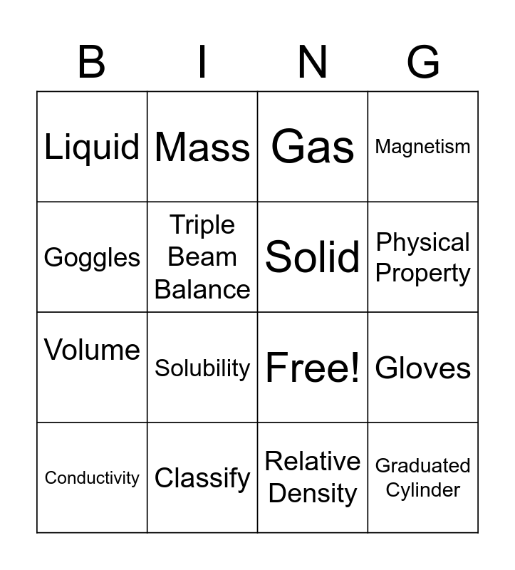This bingo card has 21 words: Classify, Matter, Mass, Physical State, Relative Density, Solid, Liquid, Gas, Free!, Physical Property, Volume, Magnetism, Graduated Cylinder, Grams, Triple Beam Balance, Conductivity (thermal/electrical), Conductivity, Solubility, Goggles, Gloves and Fire Extinguiser.