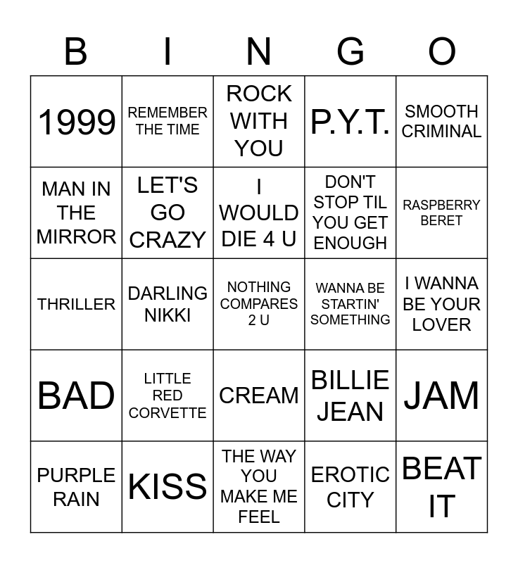 This bingo card has 27 words: BILLIE JEAN, BEAT IT, DON'T STOP TIL YOU GET ENOUGH, THE WAY YOU MAKE ME FEEL, MAN IN THE MIRROR, ROCK WITH YOU, REMEMBER THE TIME, BAD, WANNA BE STARTIN' SOMETHING, JAM, THRILLER, P.Y.T., PURPLE RAIN, KISS, RASPBERRY BERET, WHEN DOVES CRY, LET'S GO CRAZY, I WOULD DIE 4 U, LITTLE RED CORVETTE, 1999, I WANNA BE YOUR LOVER, EROTIC CITY, DARLING NIKKI, NOTHING COMPARES 2 U, CREAM, SMOOTH CRIMINAL and DIRTY DIANA.