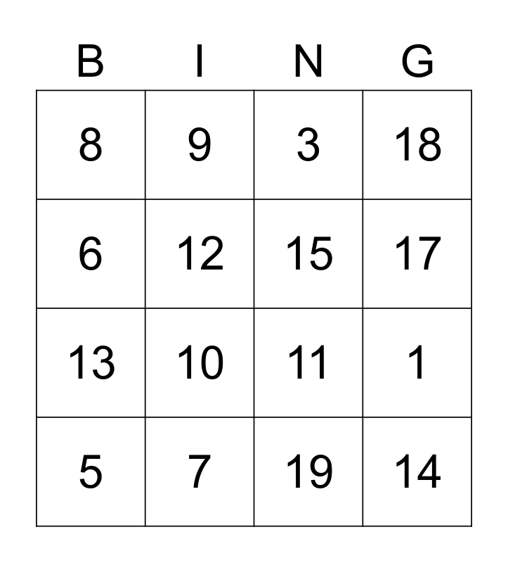 This bingo card has 20 words: 1, 2, 3, 4, 5, 6, 7, 8, 13, 9, 10, 11, 12, 14, 15, 16, 17, 18, 19 and 20.