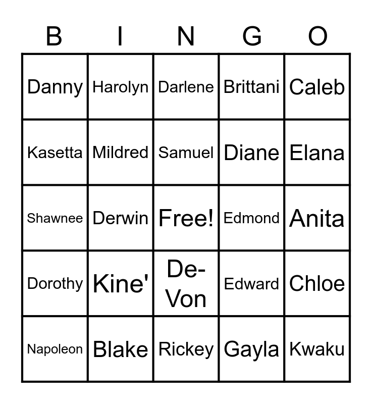 This bingo card has a free space and 70 words: Aletha, Anita, April, Asiah, Blake, Brian, Brittani, Broderick, Caleb, Cedric, Chloe, Chyna, Danny, Darlene, Debra, Derwin, De-Von, Diane, Dillan, Dorothy, Edmond, Edward, Elana, Elanis, Erika, Faye, Flecia, Gary, Gayla, Gloria, Harolyn, Hattie, Isaac, Jackie, Jacqueline, Janet, Johnny, Joy, Jurnee, Kasetta, Khloe, Kine', Kwaku, Lewis, Lillian, Mildred, Napoleon, Nell, Noah, Olessa, Patricia, Paula, Reginald, Richard, Rickey, Rona, Samuel, Shani, Sharmaine, Shavondalyn, Shawnee, Shelda, Shelton, Ta'Yon, Theresa, Timothy, Tish, Torren, Tralicia and Vernon.