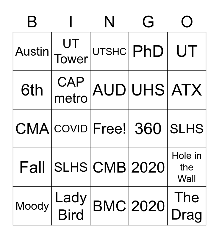 This bingo card has a free space and 24 words: SLHS, Lady Bird, AUD, Moody, UT, Austin, 6th, UT Tower, 360, CMB, UHS, CMA, 2020, Hole in the Wall, CAP metro, 2020, SLHS, UTSHC, ATX, COVID, The Drag, Fall, PhD and BMC.