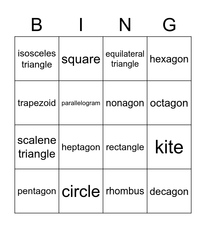 This bingo card has 16 words: circle, kite, equilateral triangle, isosceles triangle, scalene triangle, square, rectangle, rhombus, trapezoid, parallelogram, pentagon, hexagon, heptagon, octagon, nonagon and decagon.