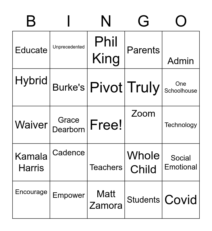 This bingo card has a free space and 24 words: Cadence, Empower, Pivot, Encourage, Admin, Educate, Hybrid, Unprecedented, Zoom, Teachers, Truly, Waiver, Whole Child, Social Emotional, Burke's, Students, Technology, Phil King, One Schoolhouse, Grace Dearborn, Covid, Kamala Harris, Parents and Matt Zamora.