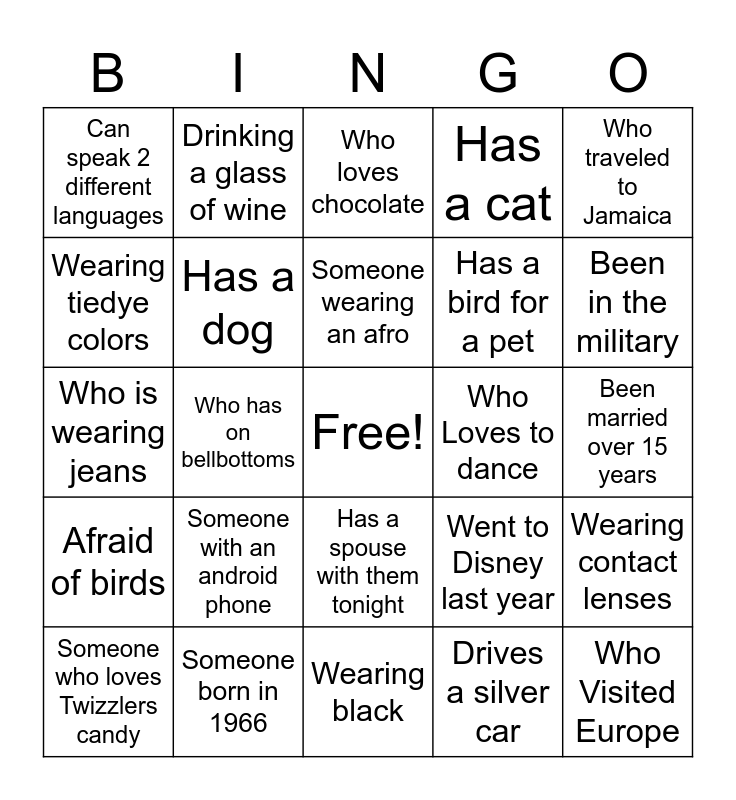 This bingo card has a free space and 24 words: Someone with an android phone, Someone born in 1966, Someone wearing an afro, Someone who loves Twizzlers candy, Who traveled to Jamaica, Can speak 2 different languages, Wearing tiedye colors, Drinking a glass of wine, Who Loves to dance, Has a spouse with them tonight, Has a bird for a pet, Who is wearing jeans, Went to Disney last year, Wearing contact lenses, Has a dog, Drives a silver car, Been married over 15 years, Who loves chocolate, Been in the military, Who has on bellbottoms, Who Visited Europe, Afraid of birds, Has a cat and Wearing black.