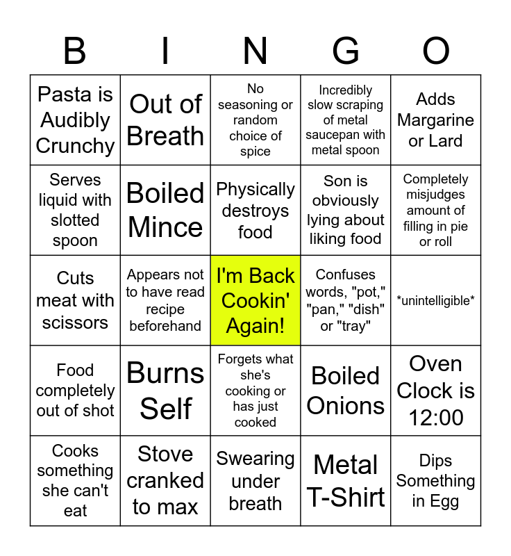 This bingo card has a free space and 24 words: Burns Self, Stove cranked to max, Physically destroys food, Cooks something she can't eat, Adds Margarine or Lard, Pasta is Audibly Crunchy, Serves liquid with slotted spoon, Out of Breath, Confuses words, "pot," "pan," "dish" or "tray", Forgets what she's cooking or has just cooked, Son is obviously lying about liking food, Cuts meat with scissors, Boiled Onions, Oven Clock is 12:00, Boiled Mince, Metal T-Shirt, *unintelligible*, No seasoning or random choice of spice, Completely misjudges amount of filling in pie or roll, Appears not to have read recipe beforehand, Dips Something in Egg, Food completely out of shot, Incredibly slow scraping of metal saucepan with metal spoon and Swearing under breath.