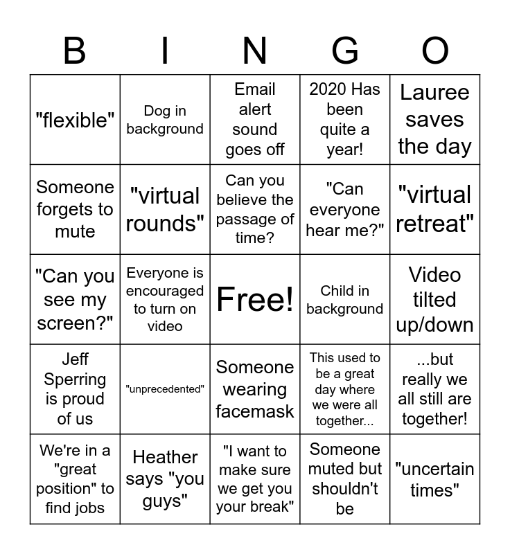This bingo card has a free space and 24 words: "unprecedented", Heather says "you guys", Can you believe the passage of time?, We're in a "great position" to find jobs, Lauree saves the day, "flexible", Someone forgets to mute, Dog in background, Child in background, Someone wearing facemask, "Can everyone hear me?", "Can you see my screen?", This used to be a great day where we were all together..., ...but really we all still are together!, "virtual rounds", Someone muted but shouldn't be, Video tilted up/down, Email alert sound goes off, "virtual retreat", Everyone is encouraged to turn on video, "uncertain times", Jeff Sperring is proud of us, 2020 Has been quite a year! and "I want to make sure we get you your break".