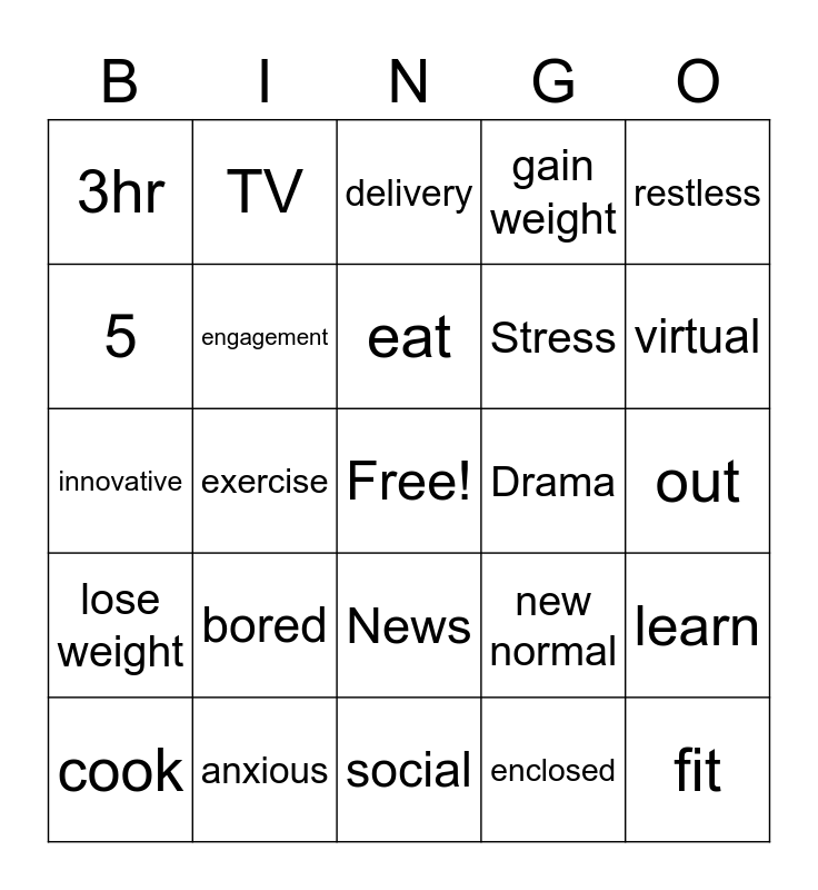 This bingo card has a free space and 24 words: bored, anxious, eat, cook, restless, 3hr, 5, TV, Drama, News, Stress, innovative, new normal, learn, engagement, enclosed, out, delivery, virtual, exercise, fit, lose weight, gain weight and social.