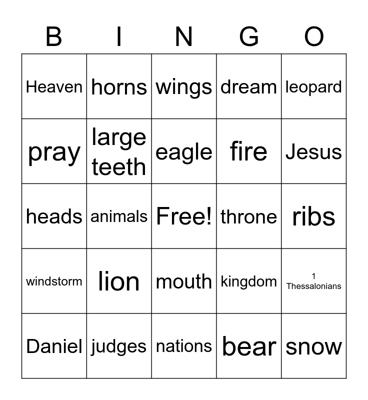This bingo card has a free space and 24 words: Daniel, lion, eagle, bear, leopard, Heaven, horns, wings, throne, ribs, heads, large teeth, kingdom, 1 Thessalonians, pray, judges, nations, dream, Jesus, windstorm, animals, mouth, fire and snow.