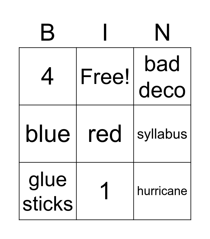 This bingo card has 12 words: Jag spirit, hurricane, red, syllabus, Free!, bad deco, 1, 3, 4, blue, glue sticks and manners.