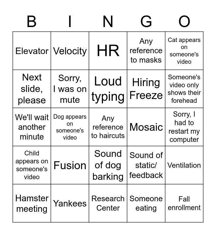 This bingo card has 41 words: Free!, We'll wait another minute, You're on mute, Sorry, I was on mute, Yankees, Sound of dog barking, Loud typing, Can everyone see my screen?, Cat appears on someone's video, Child appears on someone's video, Dog appears on someone's video, Any reference to masks, Any reference to haircuts, Sorry, I had to restart my computer, Mosaic, Fusion, Data Center, Elevator, Travel, HR, Ventilation, Fall enrollment, Research Center, Hiring Freeze, Survey, LinkedIn Learning, Someone eating, Someone drinking, Someone's video only shows their forehead, 2.0, 3.0, Velocity, Hamster meeting, Hard stop, Sound of static/ feedback, Next slide, please, No, sorry, you go ahead, Someone calling in from their car, Dashboard, LER (Learning & Employment Record) and Someone's video shows they're outside.