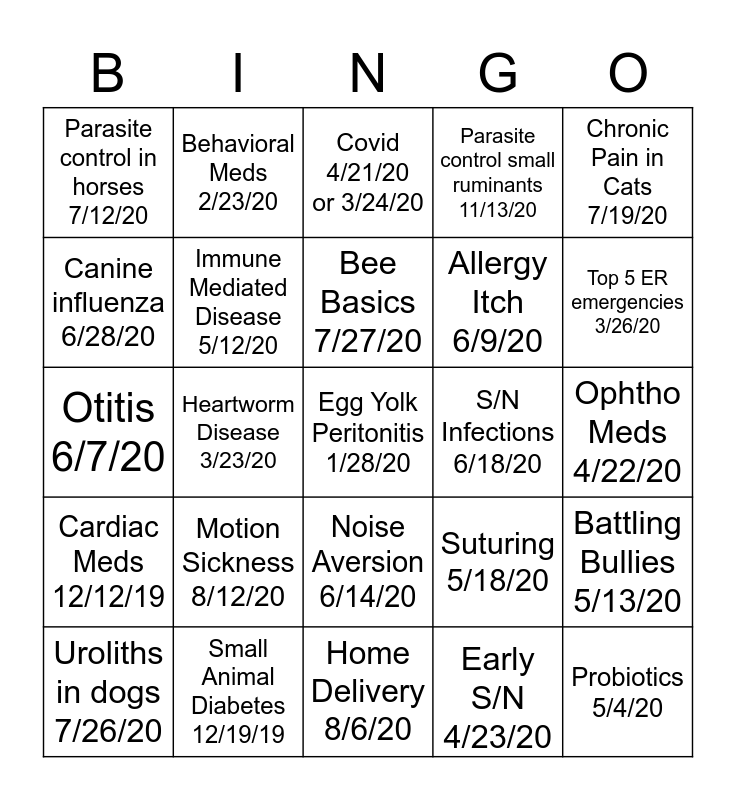 This bingo card has 25 words: Motion Sickness 8/12/20, Home Delivery 8/6/20, Bee Basics 7/27/20, Uroliths in dogs 7/26/20, Chronic Pain in Cats 7/19/20, Parasite control in horses 7/12/20, Canine influenza 6/28/20, Behavioral Meds 2/23/20, S/N Infections 6/18/20, Noise Aversion 6/14/20, Allergy Itch 6/9/20, Otitis 6/7/20, Suturing 5/18/20, Battling Bullies 5/13/20, Immune Mediated Disease 5/12/20, Probiotics 5/4/20, Ophtho Meds 4/22/20, Covid 4/21/20 or 3/24/20, Top 5 ER emergencies 3/26/20, Heartworm Disease 3/23/20, Egg Yolk Peritonitis 1/28/20, Small Animal Diabetes 12/19/19, Cardiac Meds 12/12/19, Parasite control small ruminants 11/13/20 and Early S/N 4/23/20.