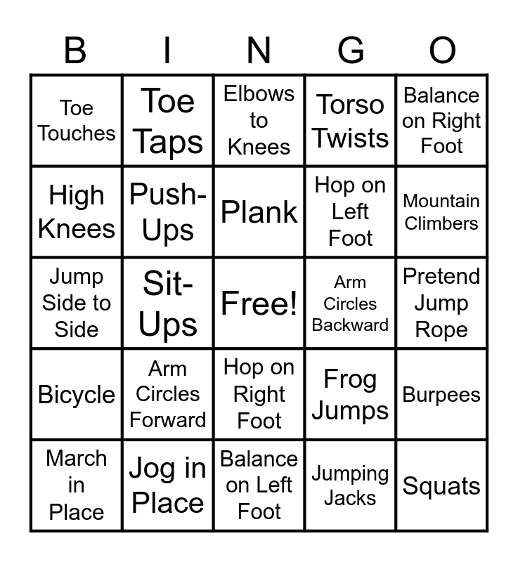This bingo card has a free space and 24 words: Arm Circles Forward, Jog in Place, Plank, March in Place, Balance on Right Foot, Toe Touches, High Knees, Toe Taps, Arm Circles Backward, Hop on Right Foot, Hop on Left Foot, Jump Side to Side, Frog Jumps, Burpees, Push-Ups, Jumping Jacks, Pretend Jump Rope, Elbows to Knees, Mountain Climbers, Sit-Ups, Squats, Bicycle, Torso Twists and Balance on Left Foot.
