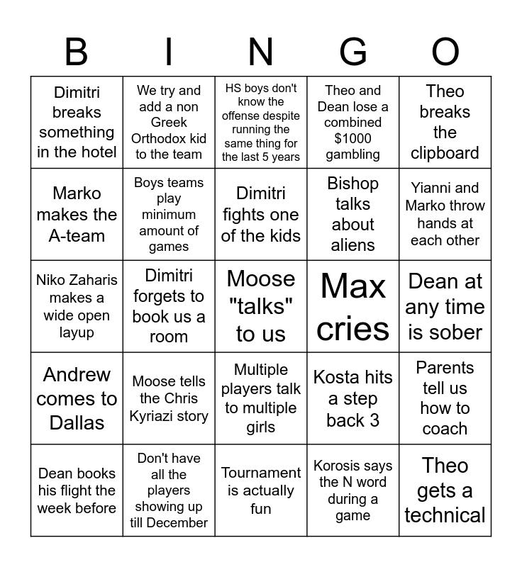 This bingo card has a free space and 24 words: Moose tells the Chris Kyriazi story, Don't have all the players showing up till December, Dimitri fights one of the kids, Dean books his flight the week before, Theo breaks the clipboard, Dimitri breaks something in the hotel, Marko makes the A-team, We try and add a non Greek Orthodox kid to the team, Max cries, Multiple players talk to multiple girls, Bishop talks about aliens, Niko Zaharis makes a wide open layup, Kosta hits a step back 3, Parents tell us how to coach, Boys teams play minimum amount of games, Korosis says the N word during a game, Dean at any time is sober, HS boys don't know the offense despite running the same thing for the last 5 years, Yianni and Marko throw hands at each other, Dimitri forgets to book us a room, Theo gets a technical, Andrew comes to Dallas, Theo and Dean lose a combined $1000 gambling and Tournament is actually fun.