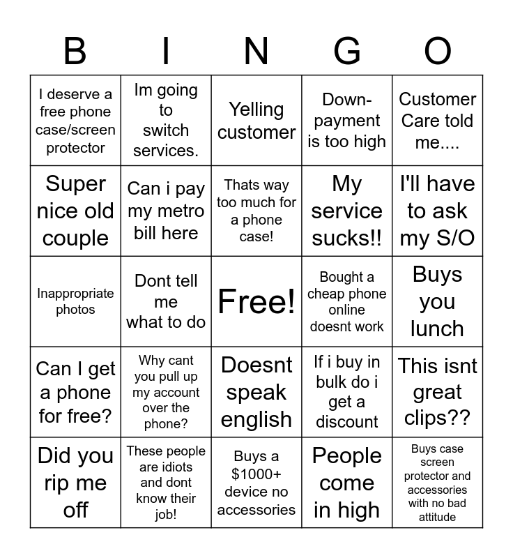 This bingo card has a free space and 24 words: Why cant you pull up my account over the phone?, These people are idiots and dont know their job!, Thats way too much for a phone case!, Did you rip me off, Customer Care told me...., I deserve a free phone case/screen protector, Super nice old couple, Im going to switch services., Bought a cheap phone online doesnt work, Doesnt speak english, My service sucks!!, Inappropriate photos, If i buy in bulk do i get a discount, This isnt great clips??, Can i pay my metro bill here, People come in high, Buys you lunch, Yelling customer, I'll have to ask my S/O, Dont tell me what to do, Buys case screen protector and accessories with no bad attitude, Can I get a phone for free?, Down- payment is too high and Buys a $1000+ device no accessories.