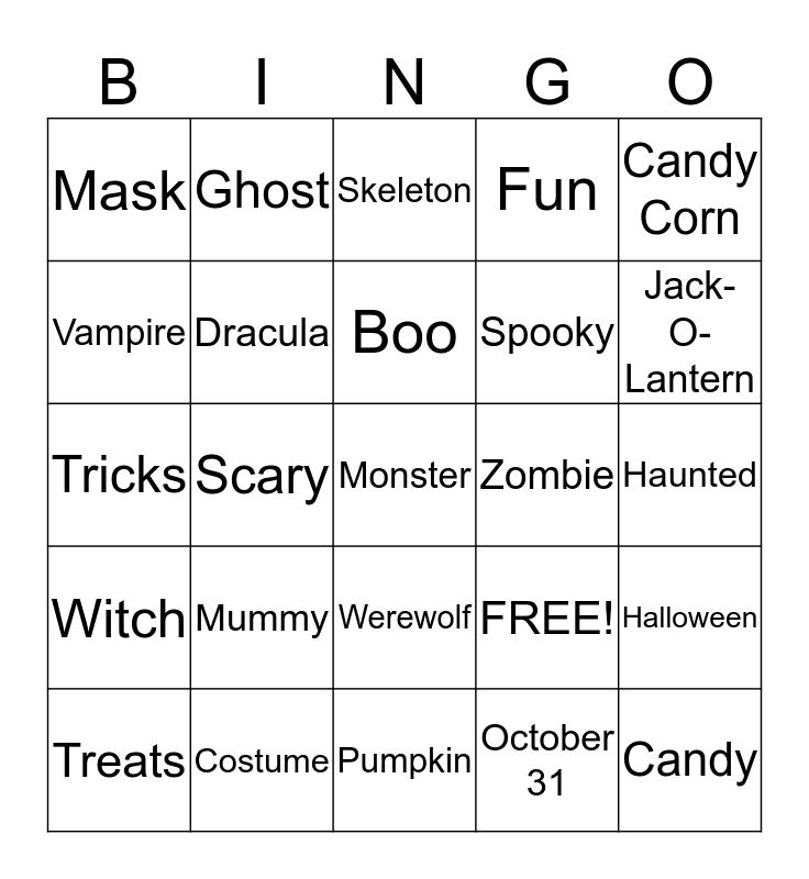 This bingo card has 25 words: Mummy, Pumpkin, Boo, Treats, Candy Corn, Mask, Vampire, Ghost, Zombie, Werewolf, Spooky, Tricks, FREE!, Halloween, Dracula, Candy, Haunted, Skeleton, Jack-O-Lantern, Scary, Monster, Costume, Witch, Fun and October 31.