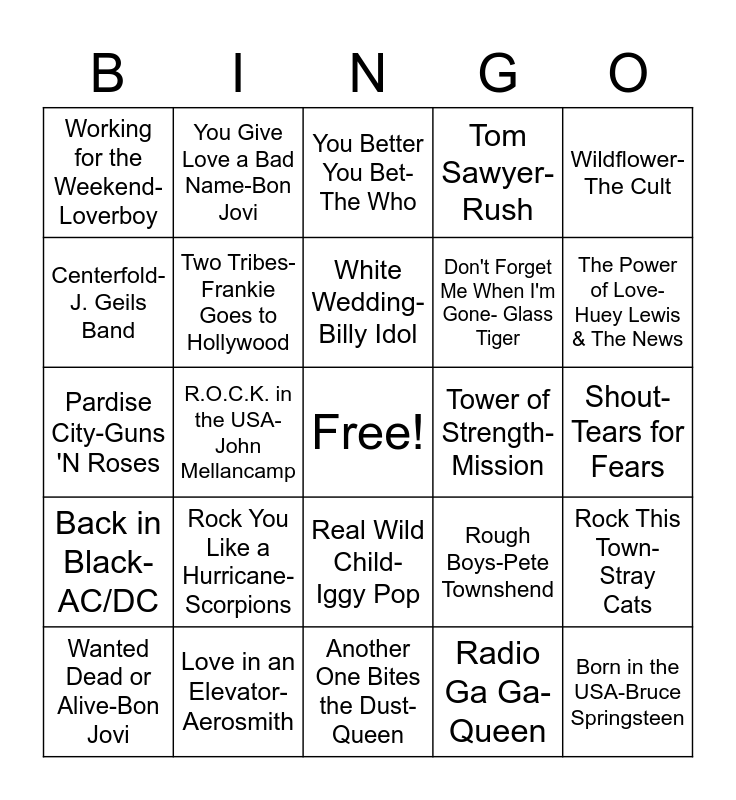 This bingo card has a free space and 24 words: Rock You Like a Hurricane-Scorpions, Love in an Elevator-Aerosmith, White Wedding-Billy Idol, Wanted Dead or Alive-Bon Jovi, Wildflower-The Cult, Working for the Weekend-Loverboy, Centerfold-J. Geils Band, You Give Love a Bad Name-Bon Jovi, Tower of Strength-Mission, Real Wild Child-Iggy Pop, Don't Forget Me When I'm Gone- Glass Tiger, Pardise City-Guns 'N Roses, Rough Boys-Pete Townshend, Rock This Town-Stray Cats, Two Tribes-Frankie Goes to Hollywood, Radio Ga Ga-Queen, Shout- Tears for Fears, You Better You Bet-The Who, The Power of Love-Huey Lewis & The News, R.O.C.K. in the USA-John Mellancamp, Born in the USA-Bruce Springsteen, Back in Black-AC/DC, Tom Sawyer-Rush and Another One Bites the Dust-Queen.