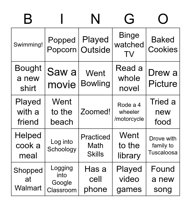 This bingo card has a free space and 24 words: Log into Schoology, Logging into Google Classroom, Went Bowling, Shopped at Walmart, Baked Cookies, Swimming!, Bought a new shirt, Popped Popcorn, Rode a 4 wheeler /motorcycle, Practiced Math Skills, Read a whole novel, Played with a friend, Went to the library, Drove with family to Tuscaloosa, Saw a movie, Played video games, Tried a new food, Played Outside, Drew a Picture, Went to the beach, Found a new song, Helped cook a meal, Binge watched TV and Has a cell phone.