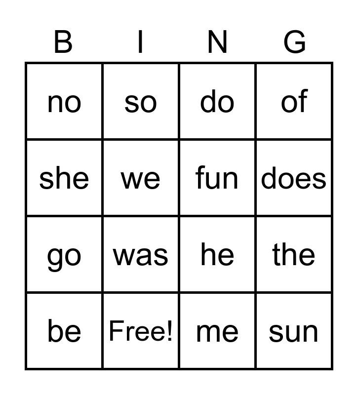 This bingo card has 16 words: Free!, the, do, no, go, so, he, me, she, we, be, of, was, does, fun and sun.