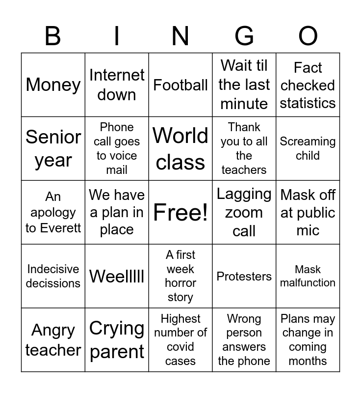 This bingo card has a free space and 24 words: Weelllll, Crying parent, World class, Angry teacher, Fact checked statistics, Money, Senior year, Internet down, Lagging zoom call, A first week horror story, Thank you to all the teachers, An apology to Everett, Protesters, Mask malfunction, Phone call goes to voice mail, Wrong person answers the phone, Mask off at public mic, Football, Screaming child, We have a plan in place, Plans may change in coming months, Indecisive decissions, Wait til the last minute and Highest number of covid cases.