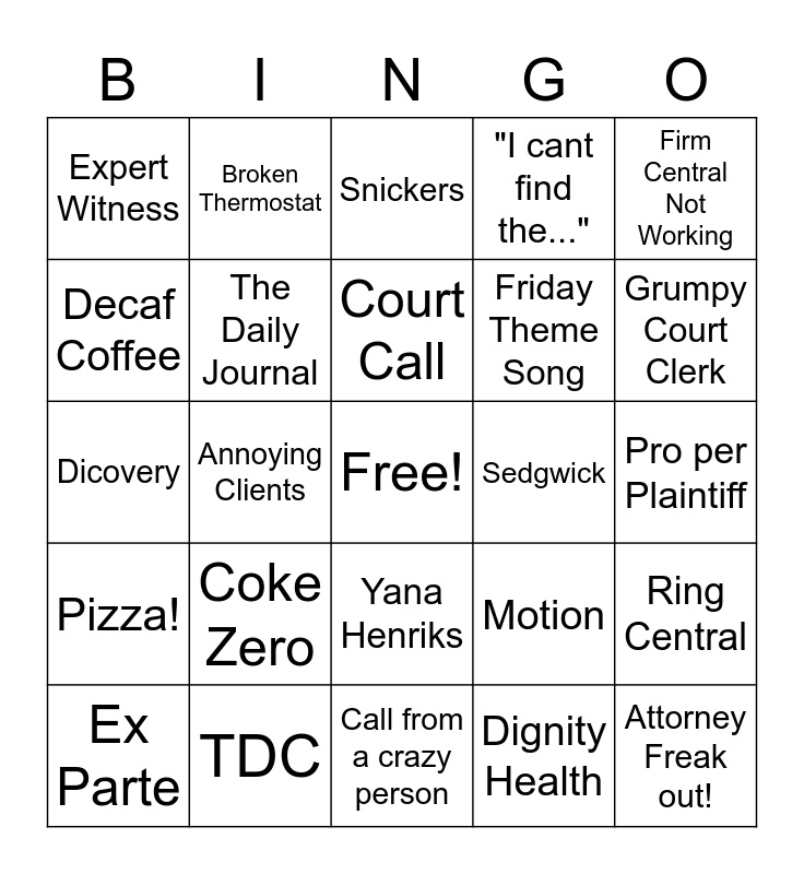This bingo card has a free space and 24 words: Coke Zero, TDC, Court Call, Ex Parte, Firm Central Not Working, Expert Witness, Decaf Coffee, Broken Thermostat, Sedgwick, Yana Henriks, Friday Theme Song, Dicovery, Motion, Ring Central, The Daily Journal, Dignity Health, Pro per Plaintiff, Snickers, Grumpy Court Clerk, Annoying Clients, Attorney Freak out!, Pizza!, "I cant find the..." and Call from a crazy person.