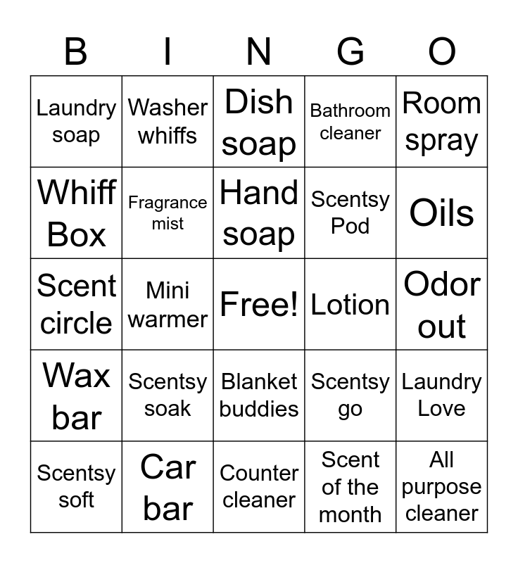 This bingo card has a free space and 33 words: Scentsy Buddy, Scentsy System, Mini warmer, Wall fan diffuser, Wax bar, Fragrance mist, Room spray, Scentsy soft, Washer whiffs, Body wash, Hand soap, Dish soap, Hand cream, Body cream, Lotion, Oils, Car bar, Scent circle, Scentsy soak, Scentsy go, Blanket buddies, Buddy clip, Laundry soap, Odor out, Counter cleaner, All purpose cleaner, Bathroom cleaner, Scentsy Pod, Whiff Box, Laundry Love, Subscription, Scent of the month and Warmer of the month.