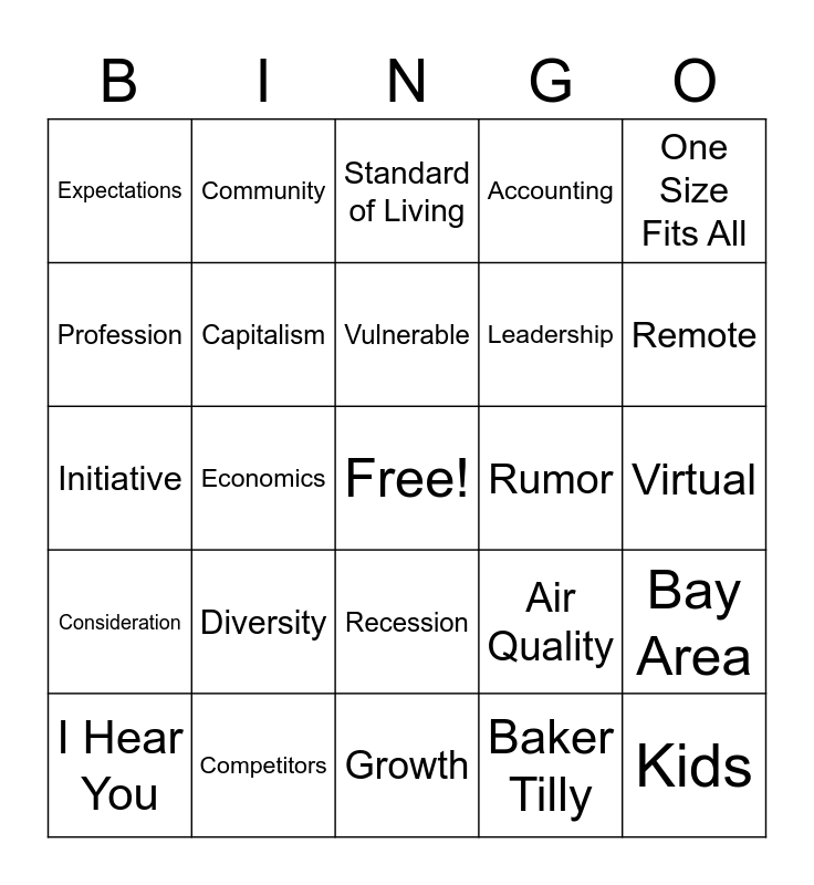 This bingo card has a free space and 30 words: Competitors, Business, Economics, Firm Position, Expectations, Standard of Living, Capitalism, Recession, Rumor, Growth, Virtual, Kids, Baker Tilly, Normalize, Remote, Evacuation, Air Quality, Consideration, Diversity, One Size Fits All, Initiative, Recruiting, Community, Leadership, Profession, Accounting, Bay Area, I Hear You, Vulnerable and Managing Partners.