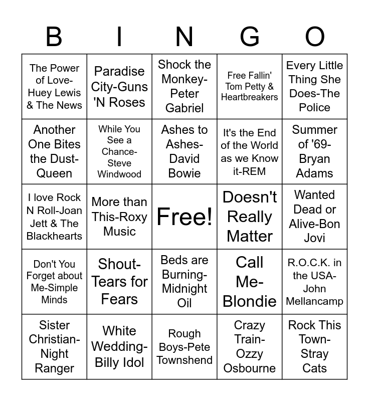 This bingo card has a free space and 24 words: Shout-Tears for Fears, White Wedding-Billy Idol, Ashes to Ashes-David Bowie, Sister Christian-Night Ranger, Every Little Thing She Does-The Police, The Power of Love-Huey Lewis & The News, Another One Bites the Dust-Queen, Paradise City-Guns 'N Roses, Doesn't Really Matter, Beds are Burning-Midnight Oil, It's the End of the World as we Know it-REM, I love Rock N Roll-Joan Jett & The Blackhearts, Call Me-Blondie, R.O.C.K. in the USA-John Mellancamp, While You See a Chance-Steve Windwood, Crazy Train-Ozzy Osbourne, Wanted Dead or Alive-Bon Jovi, Shock the Monkey-Peter Gabriel, Summer of '69-Bryan Adams, More than This-Roxy Music, Rock This Town-Stray Cats, Don't You Forget about Me-Simple Minds, Free Fallin' Tom Petty & Heartbreakers and Rough Boys-Pete Townshend.