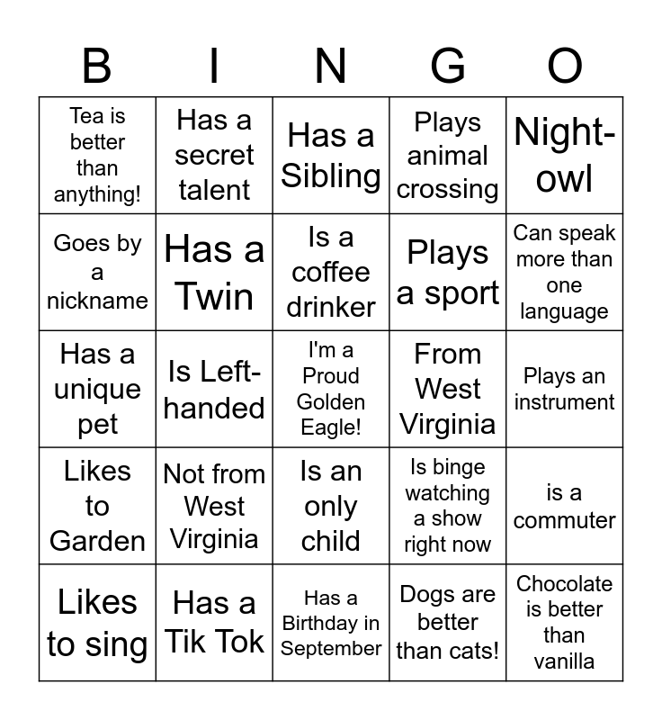 This bingo card has a free space and 30 words: Has a Tik Tok, Favorite Season is Fall, Is Left-handed, Coke is better than Pepsi, Tea is better than anything!, Has a Sibling, Has a Twin, Is an only child, From West Virginia, Has a Birthday in September, Plays an instrument, Chocolate is better than vanilla, Dogs are better than cats!, Hulu is better than Netflix, Can speak more than one language, Has been on a plane, Is binge watching a show right now, Likes to Garden, Not from West Virginia, Night-owl, Has a unique pet, Has a favorite emoji, Has a secret talent, Plays a sport, Goes by a nickname, Plays animal crossing, is a commuter, Likes to sing, Is a coffee drinker and Pencils over pens.