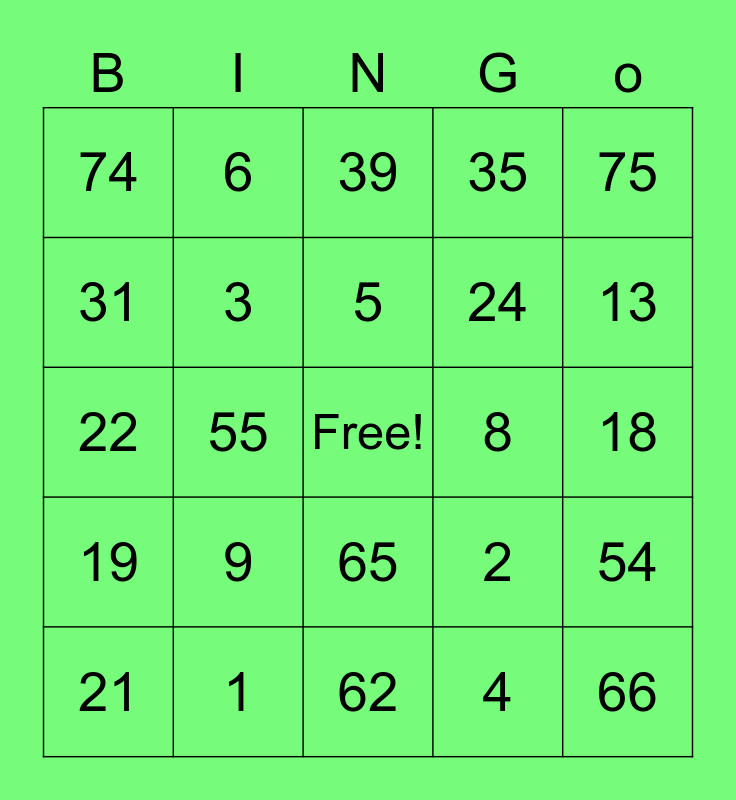 This bingo card has a free space and 24 words: 9, 1, 5, 21, 75, 74, 31, 6, 8, 65, 24, 22, 2, 54, 3, 4, 18, 39, 13, 55, 66, 19, 35 and 62.