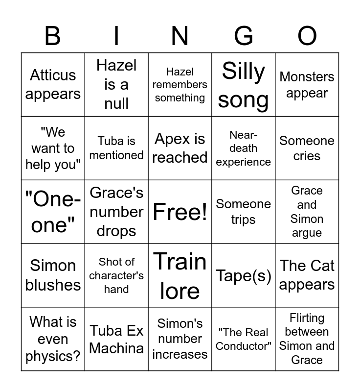This bingo card has a free space and 30 words: What is even physics?, Info on why Simon/Grace are on the train, Apex is reached, Someone leaves the train, Monsters appear, Atticus appears, Hazel is a null, Train lore, Someone trips, Flirting between Simon and Grace, Simon blushes, Tuba is mentioned, "The False Conductor", "The Real Conductor", The Cat appears, Hazel's number changes, Grace's number drops, Simon's number increases, Tape(s), Someone cries, "One-one", Tuba Ex Machina, Hazel remembers something, Near-death experience, Grace and Simon argue, "We want to help you", Shot of character's hand, Simon is feeling guilt, Silly song and Talking about the past.