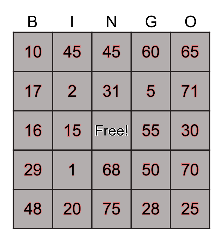 This bingo card has a free space and 24 words: 1, 20, 31, 48, 65, 10, 17, 45, 55, 68, 5, 16, 50, 70, 2, 28, 30, 45, 71, 15, 25, 29, 60 and 75.