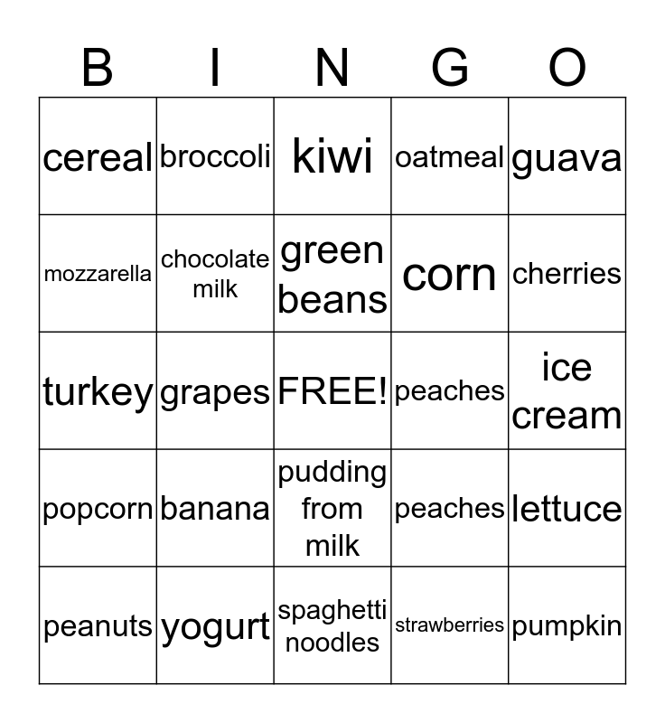 This bingo card has a free space and 24 words: banana, yogurt, green beans, peanuts, guava, cereal, mozzarella, broccoli, peaches, pudding from milk, corn, turkey, peaches, lettuce, chocolate milk, strawberries, ice cream, kiwi, cherries, grapes, pumpkin, popcorn, oatmeal and spaghetti noodles.