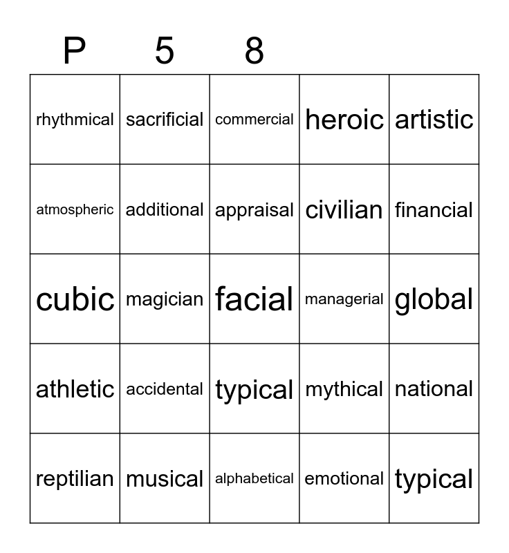 This bingo card has a free space and 24 words: accidental, musical, appraisal, reptilian, artistic, rhythmical, atmospheric, sacrificial, managerial, typical, civilian, cubic, mythical, national, additional, emotional, global, commercial, financial, magician, typical, athletic, heroic and alphabetical.