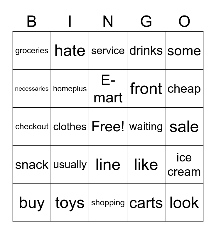 This bingo card has a free space and 25 words: usually, shopping, E-mart, buy, some, groceries, necessaries, hate, waiting, line, front, checkout, like, ice cream, homeplus, store, sale, service, cheap, clothes, look, toys, snack, drinks and carts.