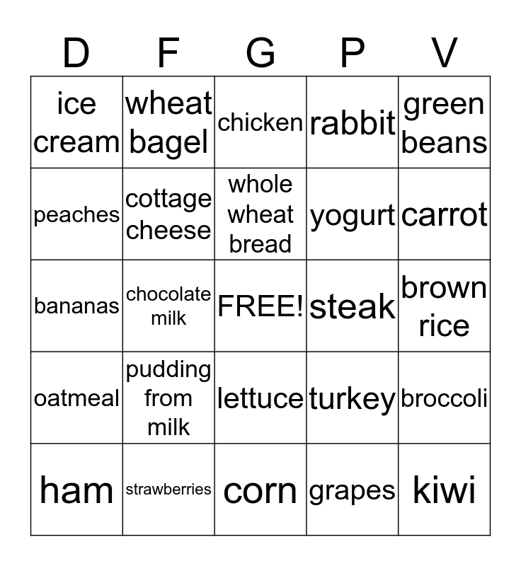 This bingo card has a free space and 24 words: pudding from milk, strawberries, whole wheat bread, ham, green beans, ice cream, peaches, wheat bagel, steak, lettuce, yogurt, bananas, turkey, broccoli, cottage cheese, grapes, brown rice, chicken, carrot, chocolate milk, kiwi, oatmeal, rabbit and corn.
