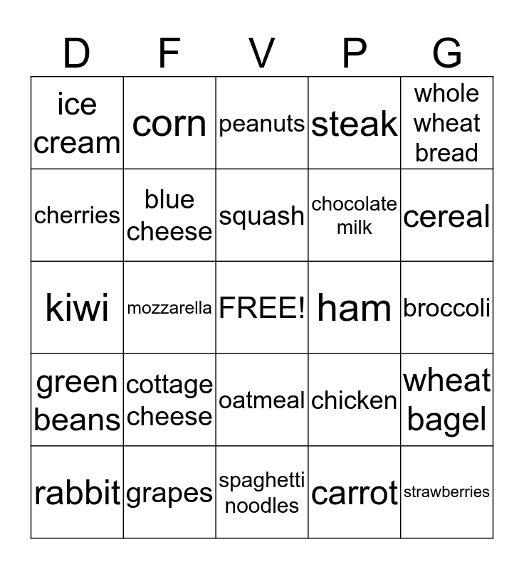 This bingo card has a free space and 24 words: cottage cheese, grapes, squash, rabbit, whole wheat bread, ice cream, cherries, corn, ham, oatmeal, chocolate milk, kiwi, chicken, wheat bagel, blue cheese, carrot, broccoli, peanuts, cereal, mozzarella, strawberries, green beans, steak and spaghetti noodles.