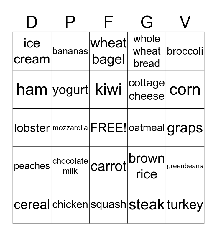 This bingo card has a free space and 24 words: chocolate milk, chicken, kiwi, cereal, broccoli, ice cream, ham, bananas, oatmeal, carrot, cottage cheese, lobster, brown rice, greenbeans, yogurt, steak, graps, wheat bagel, corn, mozzarella, turkey, peaches, whole wheat bread and squash.