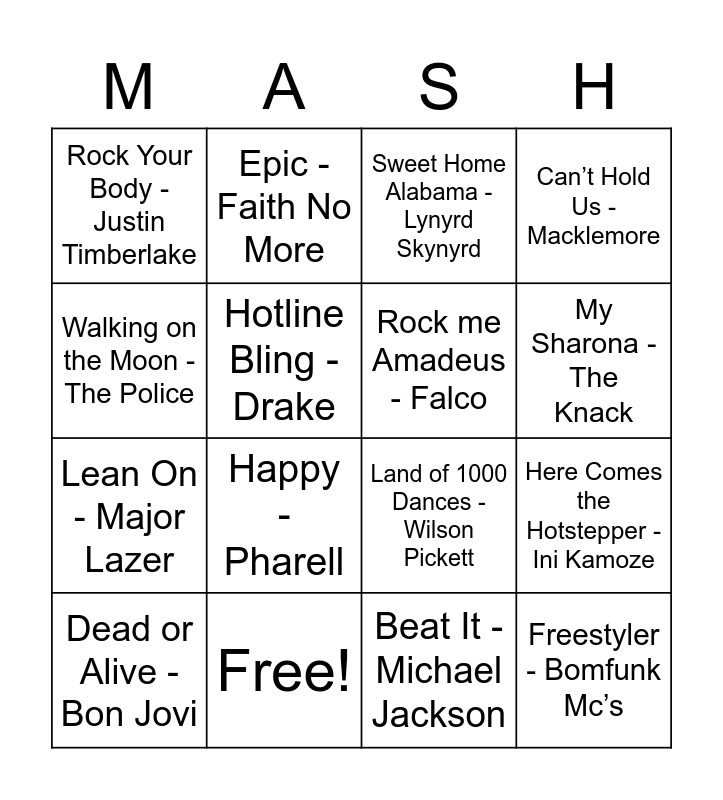 This bingo card has 16 words: Free!, Here Comes the Hotstepper - Ini Kamoze, Sweet Home Alabama - Lynyrd Skynyrd, Rock Your Body - Justin Timberlake, Lean On - Major Lazer, Epic - Faith No More, Land of 1000 Dances - Wilson Pickett, Beat It - Michael Jackson, Walking on the Moon - The Police, Hotline Bling - Drake, Dead or Alive - Bon Jovi, Can’t Hold Us - Macklemore, Happy - Pharell, My Sharona - The Knack, Rock me Amadeus - Falco and Freestyler - Bomfunk Mc’s.