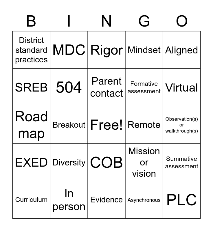 This bingo card has a free space and 34 words: Inquiry based, Asynchronous, Synchronous, Differentiation, EXED, 504, Aligned, Curriculum, MDC, LDC, Parent contact, Rigor, Anyone mentions a standardized test, District standards, Remote, Virtual, In person, Road map, Diversity, Mission or vision, COB, Engage or engaging, District standard practices, Observation(s) or walkthrough(s), Evidence, PLC, Mindset, Accountability, Formative assessment, SREB, Chat, Breakout, Summative assessment and Technology.