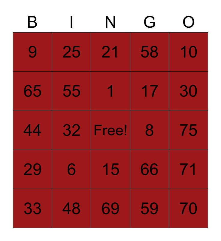 This bingo card has a free space and 24 words: 6, 48, 1, 33, 10, 9, 65, 25, 8, 15, 17, 44, 66, 71, 55, 59, 75, 21, 30, 32, 70, 29, 58 and 69.