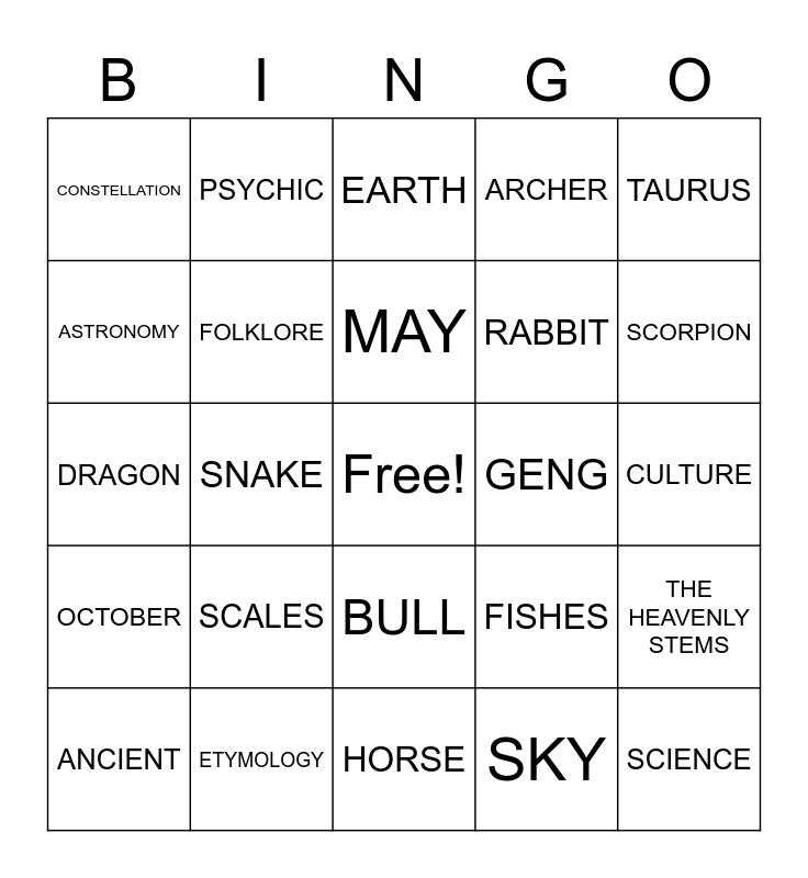 This bingo card has a free space and 106 words: ZODIAC, ARIES, TAURUS, GEMINI, CANCER, LEO, VIRGO, LIBRA SCORPIO, SAGITTARIUS, CAPRICORN, AQUARIUS, PISCES, SPRING, SUMMER, WINTER, FALL, EARTH, WIND, FIRE, RAM, BULL, TWINS, CRAB, LEO, VIRGIN, SCALES, SCORPION, ARCHER, SEA GOAT, WATER BEARER, FISHES, SKY, SUN, MOON, JANUARY, FEBRUARY, MARCH, APRIL, MAY, JUNE, JULY, AUGUST, SEPTEMBER, OCTOBER, DECEMBER, ASTRONOMY, STARS, CONSTELLATION, ASTROLOGY, SCIENCE, UNIVERSE, ETYMOLOGY, MEASUREMENT, DISTRIBUTION, ARRANGEMENT, ENERGY, EQUINOXES, DATES, HOROSCOPE, PSYCHIC, TAROT CARDS, WIZARD, NUMBERS, MONTHS, YEARS, RAT, OX, TIGER, RABBIT, DRAGON, SNAKE, HORSE, SHEEP, MONKEY, ROOSTER, DOG, PIG, CHINESE ZODIAC, YIN, YANG, JIA, YI, BING, DING, WU, JI, GENG, XIN, REN, GUI, METAL, WOOD, COMPATIBILITY, FORTUNE-TELLING, PERSONALITY, THE HEAVENLY STEMS, EARTHLY BRANCHES, FIVE ELEMENTS, LUCK, CULTURE, FOLKLORE, GREAT RACE, BUDDHA, JADE EMEROR, ANCIENT and UNLUCKY.