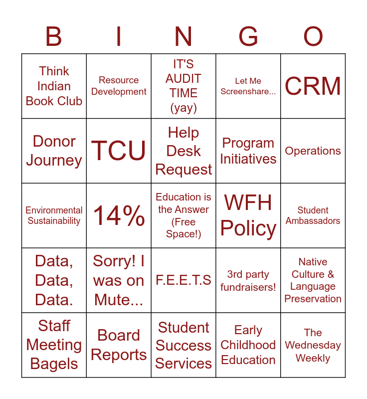 This bingo card has a free space and 39 words: Finance Feed, CONVERSION, Pandemic, TCU, Staff Meeting Bagels, F.E.E.T.S, Help Desk Request, I love Zoom Meetings, CRM, Data, Data, Data., 14%, Let Me Screenshare..., The Wednesday Weekly, Student Ambassadors, WFH Policy, Sorry! I was on Mute..., #TheNative Journey, Think Indian Book Club, EATSS, 3rd party fundraisers!, Donor Journey, Student Success Services, Program Initiatives, Operations, Data Entry, Feed The Flame, Research, Evaluation and Faculty Development, Public Education, PSA, Resource Development, NAHM, Fiscal Year End, IT'S AUDIT TIME (yay), Board Reports, Early Childhood Education, Native Pathways, Native Culture & Language Preservation, Environmental Sustainability and Indigenous Visionaries.