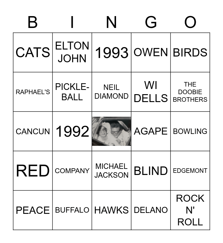 This bingo card has a free space and 27 words: BLIND, PIANO, WI DELLS, HAWKS, RAPHAEL'S, 1993, ELTON JOHN, RED, AGAPE, EDGEMONT, CANCUN, OWEN, PEACE, BUFFALO, THE DOOBIE BROTHERS, GREEN, PICKLE-BALL, NEIL DIAMOND, COMPANY, CATS, BOWLING, DELANO, 1992, ROCK N' ROLL, MICHAEL JACKSON, BIRDS and YELLOW STONE.