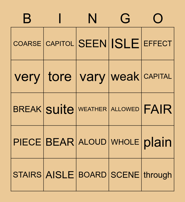 This bingo card has 45 words: Free!, WEATHER, WHETHER, STAIRS, STARES, SCENE, SEEN, AFFECT, EFFECT, AISLE, ISLE, ALLOWED, ALOUD, BEAR, BARE, BOARD, BORED, BREAK, BRAKE, CAPITAL, CAPITOL, SENT, SCENT, COARSE, COURSE, FAIR, FARE, HOLE, WHOLE, PIECE, PEACE, plain, plane, sail, sale, suite, sweet, threw, through, vary, very, weak, week, tore and tour.