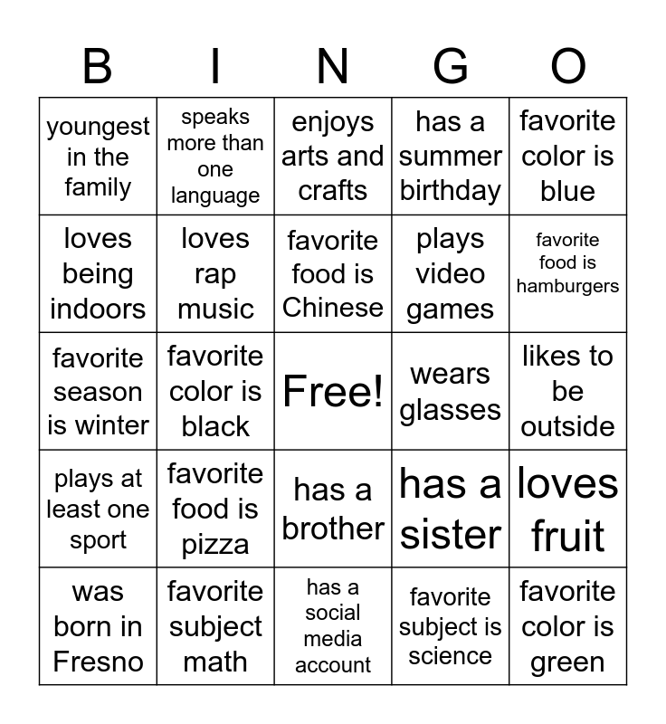 This bingo card has a free space and 24 words: favorite food is pizza, favorite subject math, favorite food is Chinese, was born in Fresno, favorite color is blue, youngest in the family, loves being indoors, speaks more than one language, wears glasses, has a brother, plays video games, favorite season is winter, has a sister, loves fruit, loves rap music, favorite subject is science, likes to be outside, enjoys arts and crafts, favorite food is hamburgers, favorite color is black, favorite color is green, plays at least one sport, has a summer birthday and has a social media account.