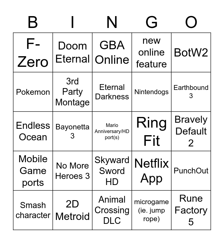 This bingo card has a free space and 24 words: No More Heroes 3, 2D Metroid, Eternal Darkness, Smash character, BotW2, F-Zero, Pokemon, Doom Eternal, Ring Fit, Skyward Sword HD, Nintendogs, Endless Ocean, Netflix App, PunchOut, 3rd Party Montage, microgame (ie. jump rope), Bravely Default 2, GBA Online, Earthbound 3, Bayonetta 3, Rune Factory 5, Mobile Game ports, new online feature and Animal Crossing DLC.