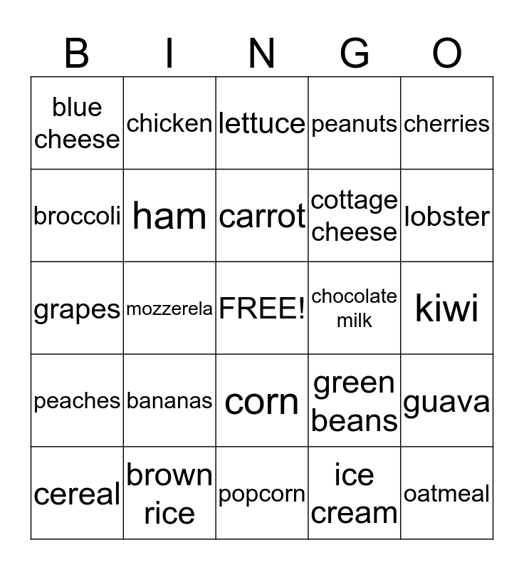 This bingo card has a free space and 24 words: bananas, brown rice, carrot, cereal, cherries, blue cheese, broccoli, chicken, chocolate milk, corn, cottage cheese, grapes, green beans, guava, ham, ice cream, kiwi, lettuce, lobster, mozzerela, oatmeal, peaches, peanuts and popcorn.