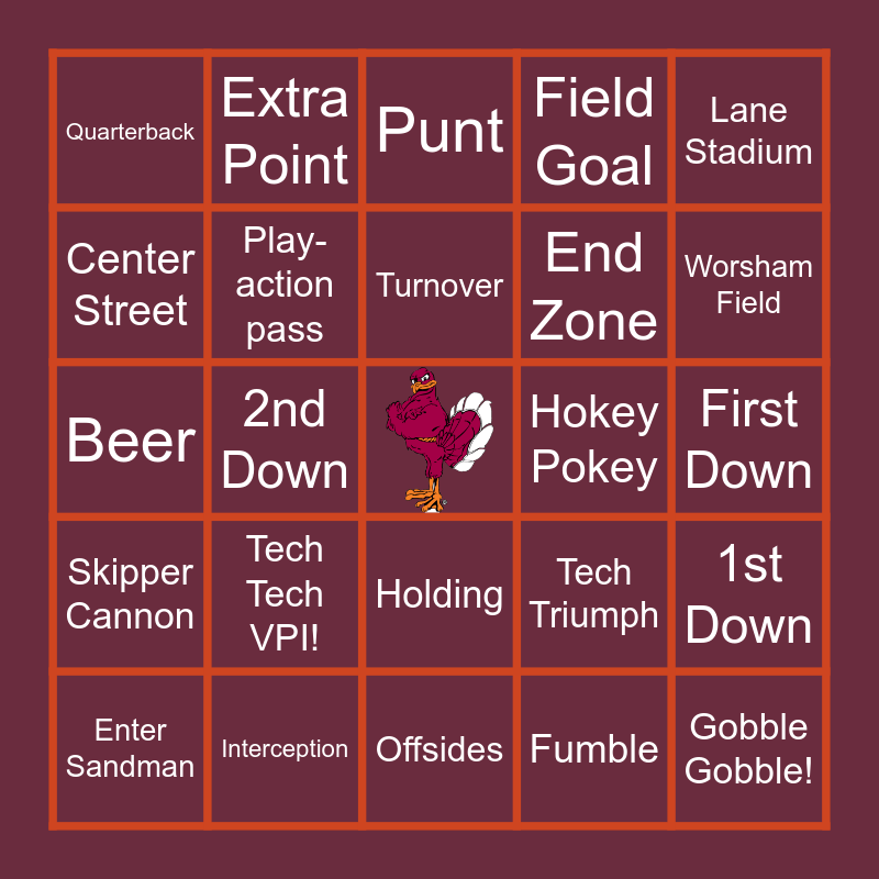 This bingo card has a free space and 44 words: Touchdown, Gobble Gobble!, False Start, Enter Sandman, Timeout, Fumble, Punt, Huddle, Lane Stadium, Interception, Field Goal, Hokey Pokey, Holding, Tech Tech VPI!, Sack, Offsides, Start Jumping!, Beer, Let's Go... Hokies!, Worsham Field, Extra Point, This Is Home, Kick Off, Quarterback, Beamer Ball, First Down, Beat UVA, Highty-Tighties, Tech Triumph, Skipper Cannon, Key Play, 1st Down, Turkey Leg, Hokie Stone, 2nd Down, 3rd Down, 4th Down, Personal Foul, Turnover, Center Street, End Zone, Snap, Play- action pass and C'Mon Ref!.